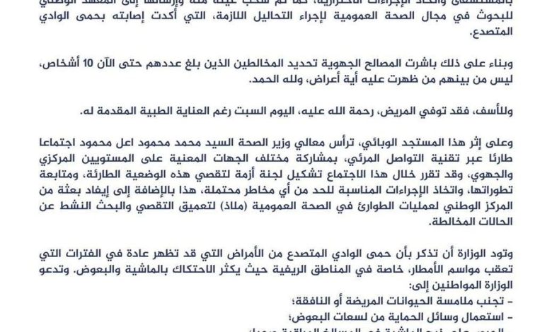 وأوضحت الوزارة أنه تم سحب عينة منه، وإرسالها إلى المعهد الوطني للبحوث في مجال الصحة العمومية لإجراء التحاليل اللازمة، التي أكدت إصابته بحمى الوادي المتصدع.