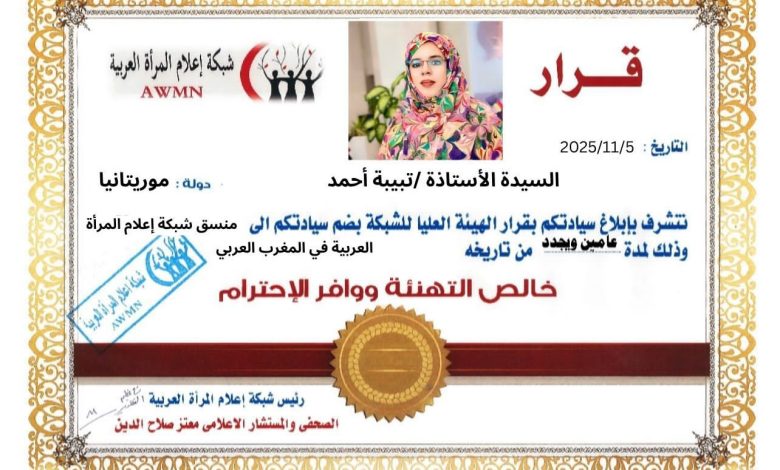 اولا ..تكليف الإعلامية الموريتانية البارزة الاستاذة تبيبة احمد فى منصب منسق شبكة إعلام المرأة العربية فى المغرب العربي مع احتفاظها بمنصبها الآخر في الشبكة وهو قيادية وعضو المجلس الاستشاري بالشبكة