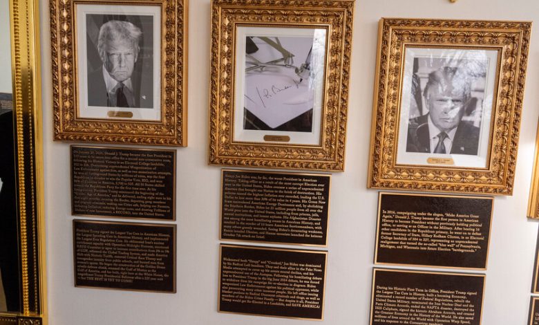 أضاف الرئيس الأمريكي دونالد ترامب لوحات جديدة أسفل كل صورة من صور رؤساء أمريكا الـ 45 في “ممشى المشاهير الرئاسي” بالبيت الأبيض، تضمنت هجمات لاذعة ضد أسلافه بايدن وأوباما وبوش.