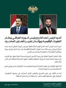 وأكد السوداني حرص العراق على حفظ أمن سوريا واستقرارها.