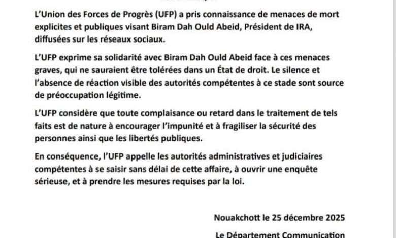 L’Union des Forces de Progrès (UFP) a pris connaissance de menaces de mort explicites et publiques visant M. Biram Dah Ould Abeid, Président de l’Initiative pour la Résurgence du Mouvement Abolitionniste (IRA), diffusées sur les réseaux sociaux.